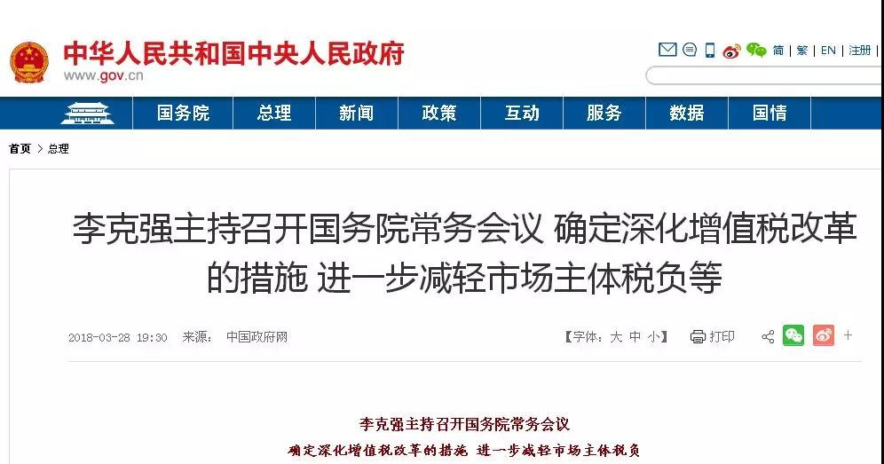 2018年3月28日國務(wù)院常務(wù)會(huì)議決定,將制造業(yè)等行業(yè)增值稅稅率從17%降至16%,將交通運(yùn)輸、建筑、基礎(chǔ)電信服務(wù)等行業(yè)及農(nóng)產(chǎn)品等貨物的增值稅稅率從11%降至10%,預(yù)計(jì)全年可減稅2400億元。
