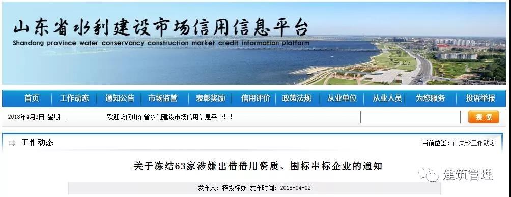 近日,山東省住建廳發(fā)現(xiàn)63家企業(yè)在水利建設(shè)市場招標投標活動中涉嫌出借借用資質(zhì)、圍標串標。